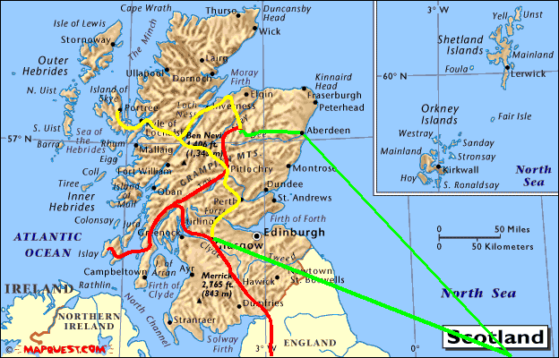 End of June 2001, 2 days before my sisters and my holidays in Scotland July 2001. The planning is almost complete. What's the big deal? Well, I live in Swindon/England, my sister in Heidelberg/Germany. I'm going on my annual visit to the Isle of Islay on the west coast, my sister is going to do some horse riding in Banffshire in the east of Scotland. And after that we will meet for a week together. Below a map of how we plan to travel... The red line is my route, the green my sisters route and the yellow line our route travelling together (roughly, we might change our plans slightly depending on the weather and room availability). |